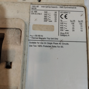 The Allen-Bradley 140U-Q6X3 circuit breaker is a circuit breaker from the Bulletin 140U series which has operational current rating of 600 Amps. There are three poles on the 140U-Q6X3 circuit breaker and this breaker is available in a Q-frame enclosure. The interrupting capacity rating for the circuit breaker is from 60 to 69 kiloamps. Q-frame breakers from the 140U family like this one support 300 to 600 Amps current ratings. Q-frame breakers support both electronic and thermal-magnetic trip units. The interrupting ratings at 380 to 415 Volts AC voltage for Q-frame breakers range from 45 to 70 kiloamps. At 480 Volts AC, the interrupting rating range is 35 to 65 kiloamps, at 600 Volts AC, the interrupting capacity range is 25 to 35 kiloamps, and at 690 Volts AC, the interrupting capacity range is 20 to 25 kiloamps.